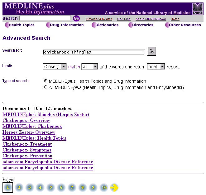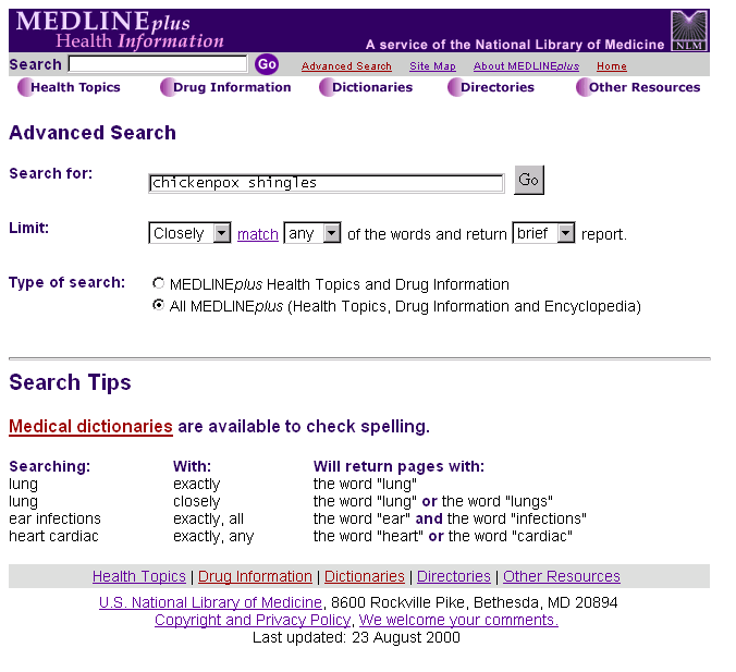 The Medical Encyclopedia contains an extensive library of medical illustrations, as well as over 4,000 articles about diseases, tests, symptoms, injuries, and surgeries. The USP DI contains information on over 9,000 brand name and generic prescription drugs and over-the-counter medications. It provides information about side effects, dosing, drug interactions, precautions and storage for each drug. Users can browse the alphabetic index for either the Medical Encyclopedia or the USP DI pages by selecting the appropriate resource from the left column of the MEDLINEplus Home Page (Figure 1). ![]() The Medical Encyclopedia (Figure 2) is found under either the Health Topics page (Browse the Medical Encyclopedia) or Dictionaries page (ADAM Medical Encyclopedia). ![]() USP DI (Figure 3) is found under Drug Information. The introductory page of each resource provides links to the alphabetical sections of their respective indexes. ![]() Users can search all three resources - MEDLINEplus Health Topics pages, the Medical Encyclopedia, and USP DI - at one time by entering search terms on the MEDLINEplus advanced search page. To get to the advanced search page from the Home Page (Figure 1), click on "Advanced Search" to the right of the Search box. On the MEDLINEplus advanced search page (Figure 4), users can enter a search term and then select which resource or resources to search within MEDLINEplus. ![]() The default search will retrieve MEDLINEplus Health Topics pages as well as USP DI pages. For example, in Figure 4, a user has entered the search terms "chickenpox shingles" and changed the second radio button so that the MEDLINEplus pages, USP DI, and the Encyclopedia will all be searched together. In the list of retrieved documents, the titles of Health Topics pages and USP DI pages are preceded by "MEDLINEplus:," but Medical Encyclopedia article titles are not. See Figure 5. ![]() Note that on the search results page the most recent search terms appear, but the search options have been returned to the default settings. The search settings can be changed from this page for a new search. Based on user feedback, NLM expects the Medical Encyclopedia and USP DI to provide more complete answers to consumer health questions. Use the "We welcome your comments" link at the bottom of each page to send feedback directly to the MEDLINEplus development team.